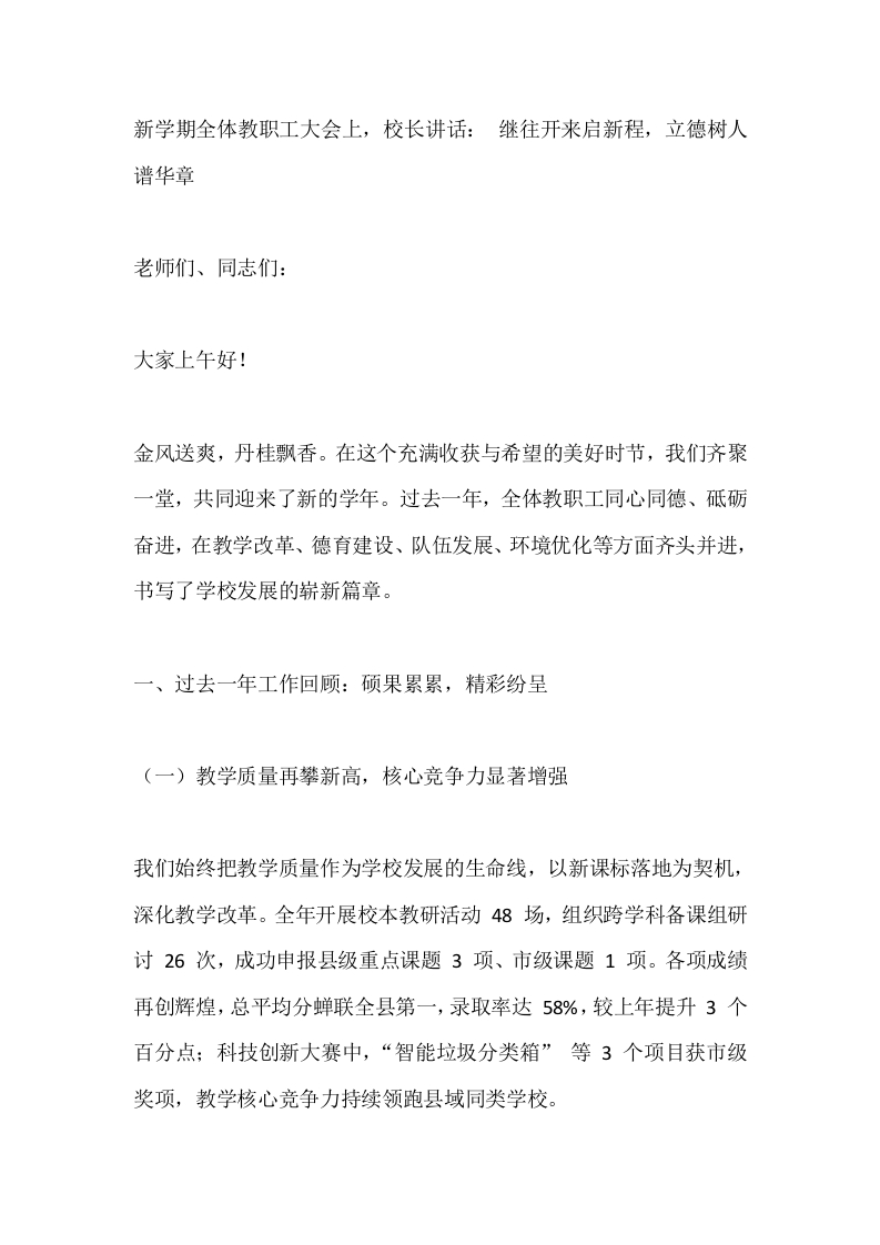 新学期全体教职工大会上,校长讲话: 继往开来启新程,立德树人谱华章