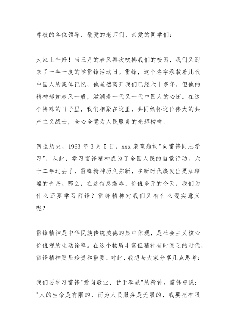 学雷锋活动日动员大会上,校长讲话:“人人学雷锋”“天天有雷锋”“时时有雷锋”!