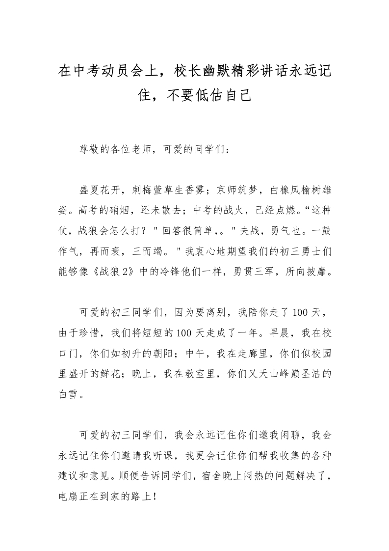 在中考动员会上,校长幽默精彩讲话永远记住,不要低估自己
