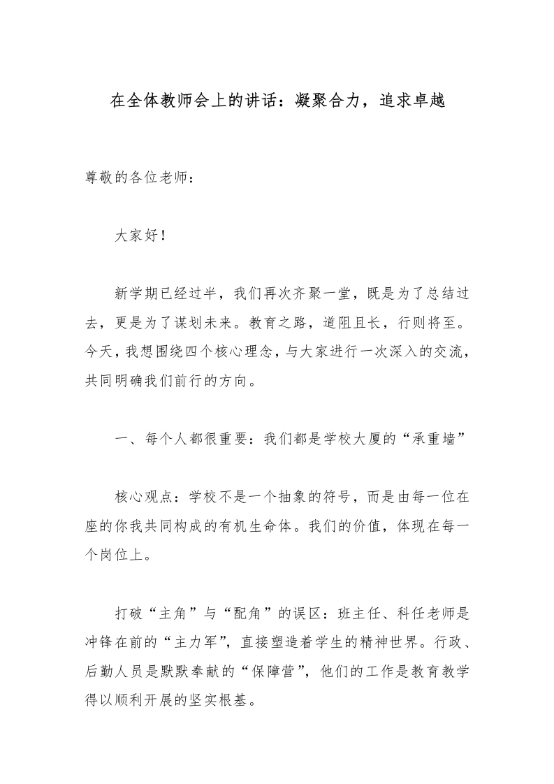 在全体教师会上的讲话:凝聚合力,追求卓越