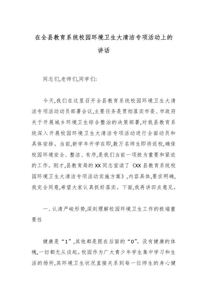 在全县教育系统校园环境卫生大清洁专项活动上的讲话