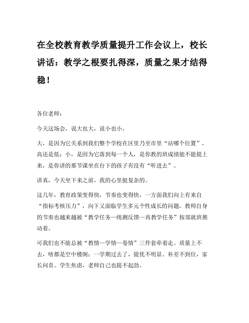 在全校教育教学质量提升工作会议上,校长讲话:教学之根要扎得深,质量之果才结得稳!