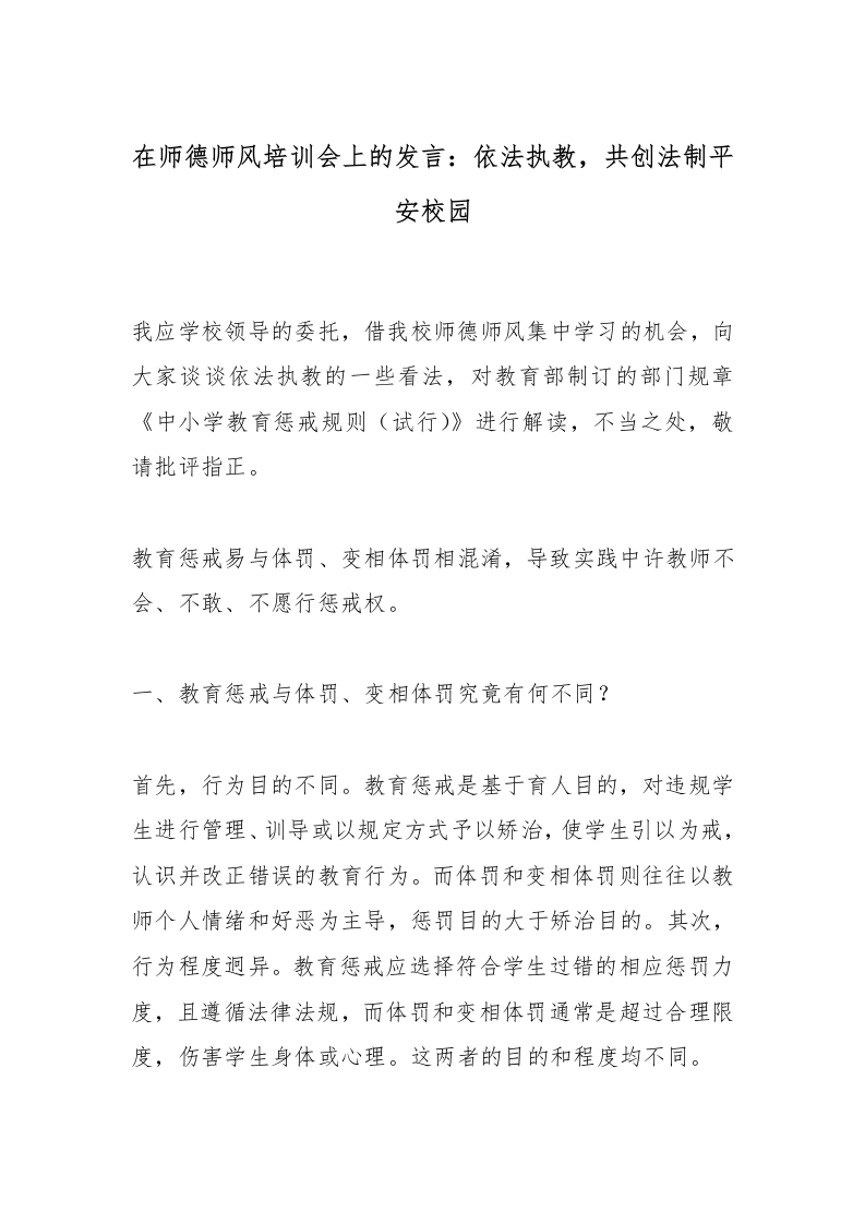 在师德师风培训会上的发言:依法执教,共创法制平安校园