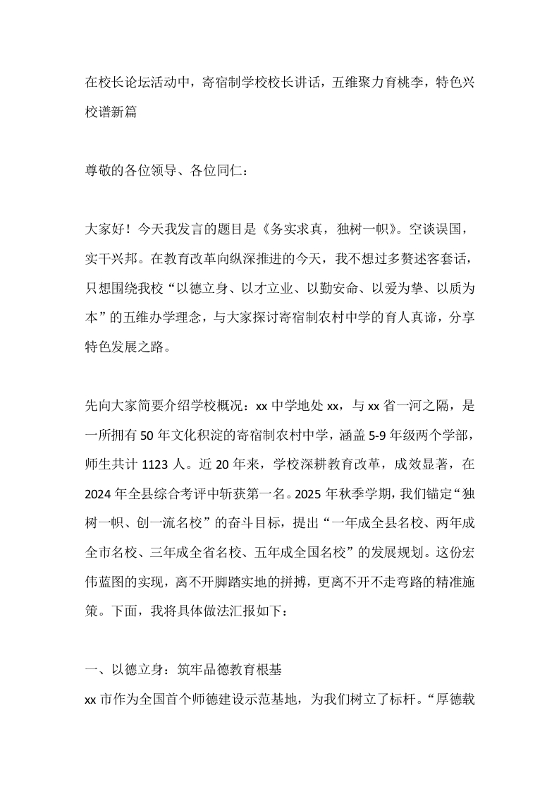 在校长论坛活动中,寄宿制学校校长讲话,五维聚力育桃李,特色兴校谱新篇