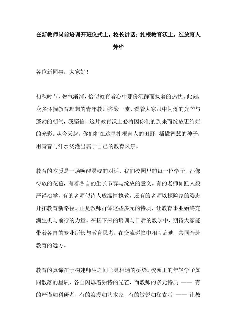 在新教师岗前培训开班仪式上,校长讲话:扎根教育沃土,绽放育人芳华
