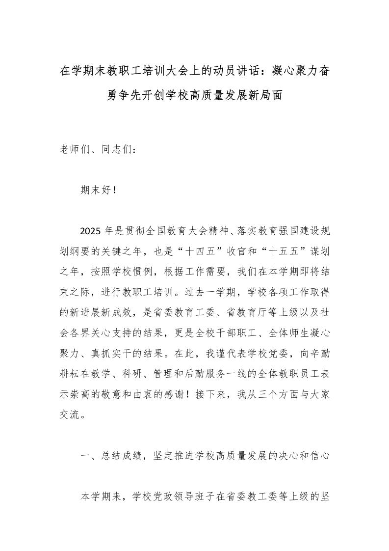 在学期末教职工培训大会上的动员讲话:凝心聚力奋勇争先开创学校高质量发展新局面