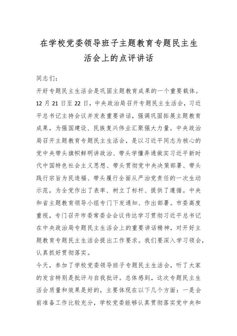 在学校党委领导班子主题教育专题民主生活会上的点评讲话