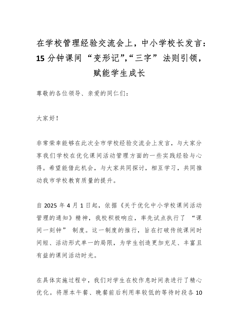 首页校长资料工作讲话在学校管理经验交流会上,中小学校长发言:15分钟课间 “变形记”,“三字” 法则引领,赋能学生成长