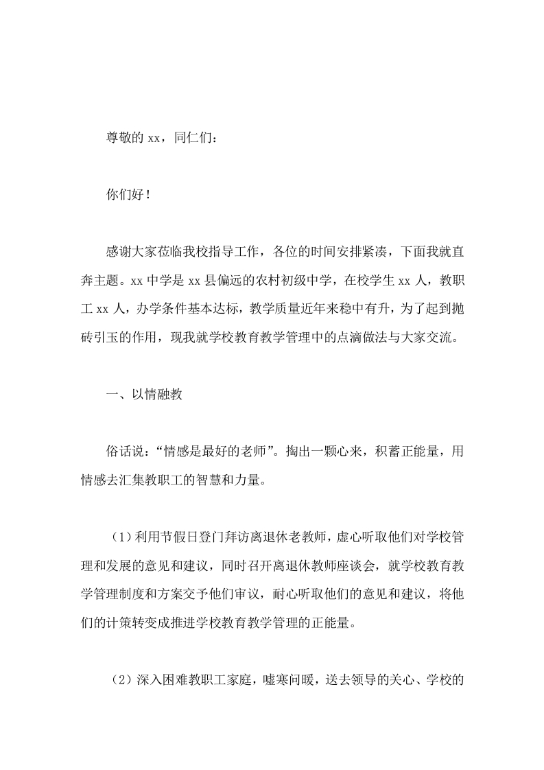 在学校教育教学经验交流会上,校长发言,主要讲了4块内容