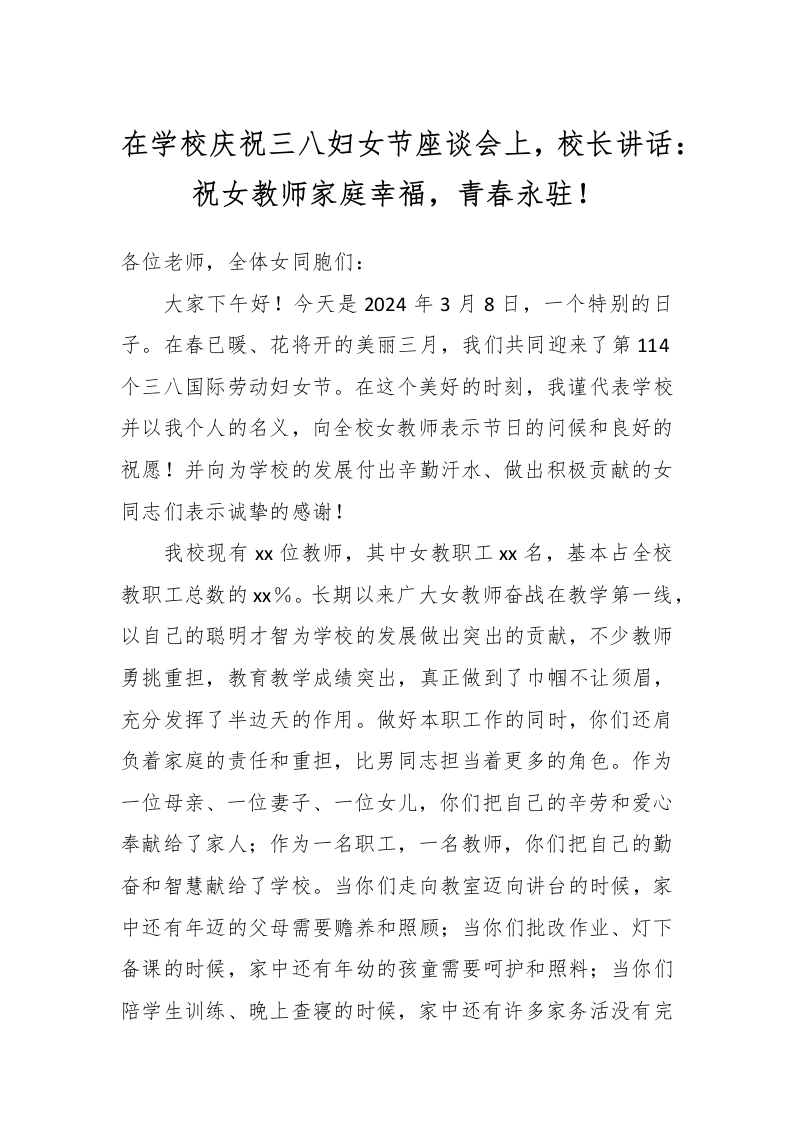 在学校庆祝三八妇女节座谈会上,校长讲话:祝女教师家庭幸福,青春永驻!