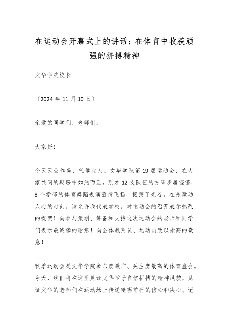 在运动会开幕式上的讲话:在体育中收获顽强的拼搏精神