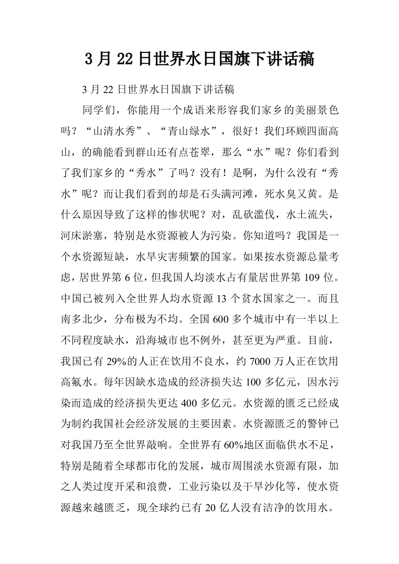 3月22日世界水日国旗下讲话稿[推荐]