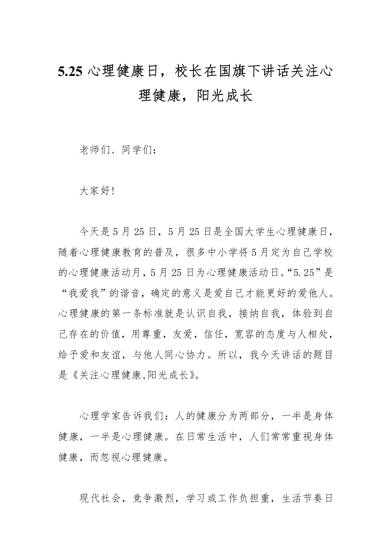5.25心理健康日,校长在国旗下讲话关注心理健康,阳光成长
