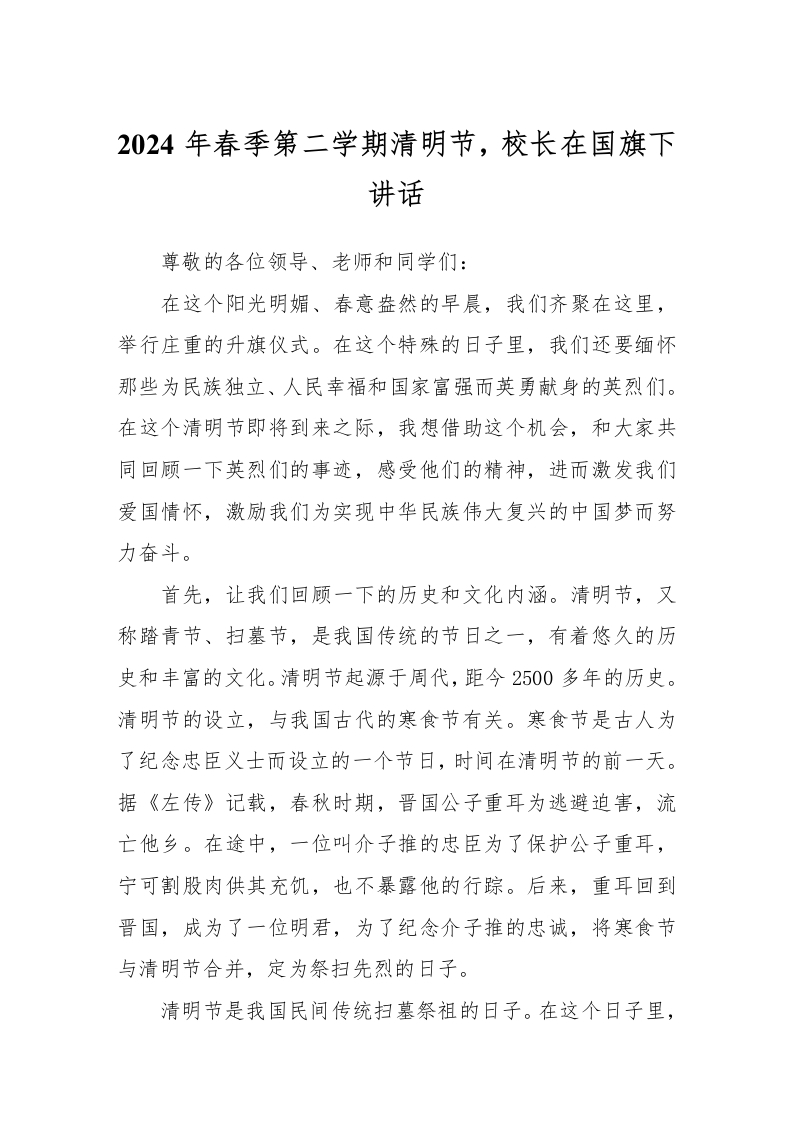 首页校长资料国旗讲话2024年春季第二学期清明节,校长在国旗下讲话