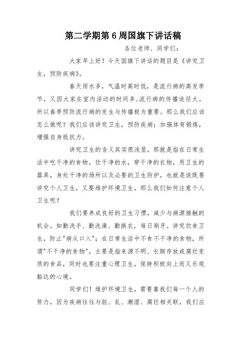 第二学期第6周国旗下讲话稿[推荐]