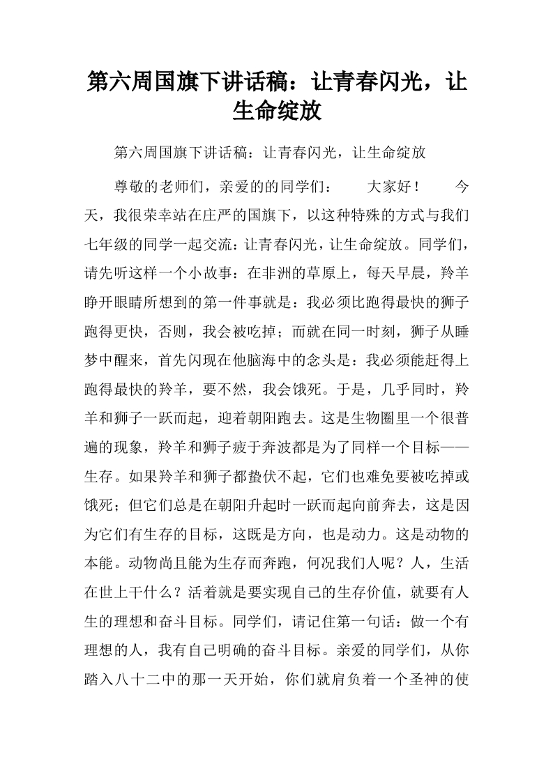 第六周国旗下讲话稿:让青春闪光,让生命绽放[推荐]