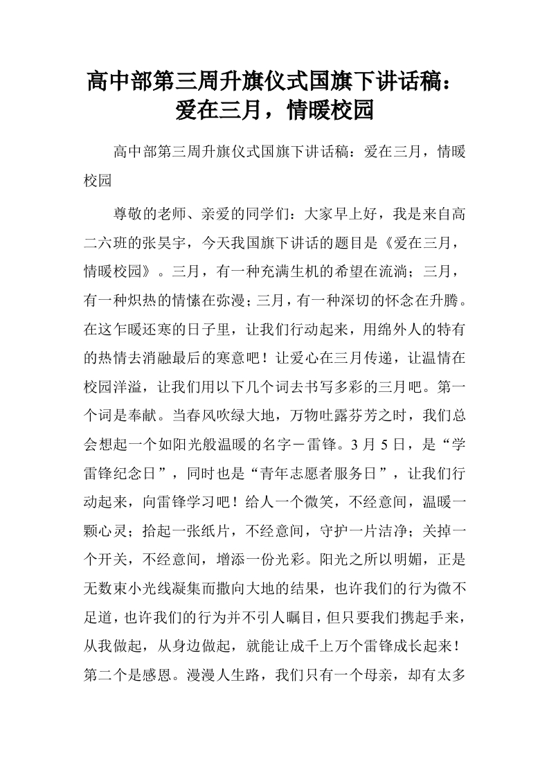 高中部第三周升旗仪式国旗下讲话稿:爱在三月,情暖校园[推荐]