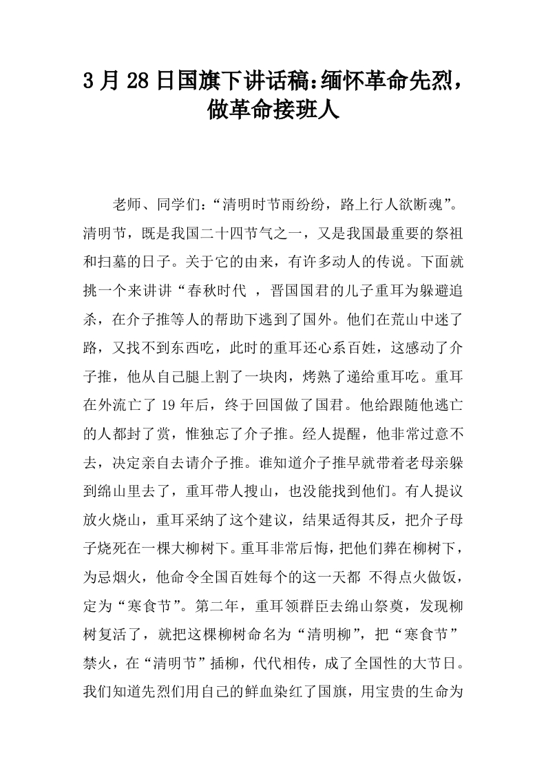 3月28日国旗下讲话稿:缅怀革命先烈,做革命接班人[推荐]