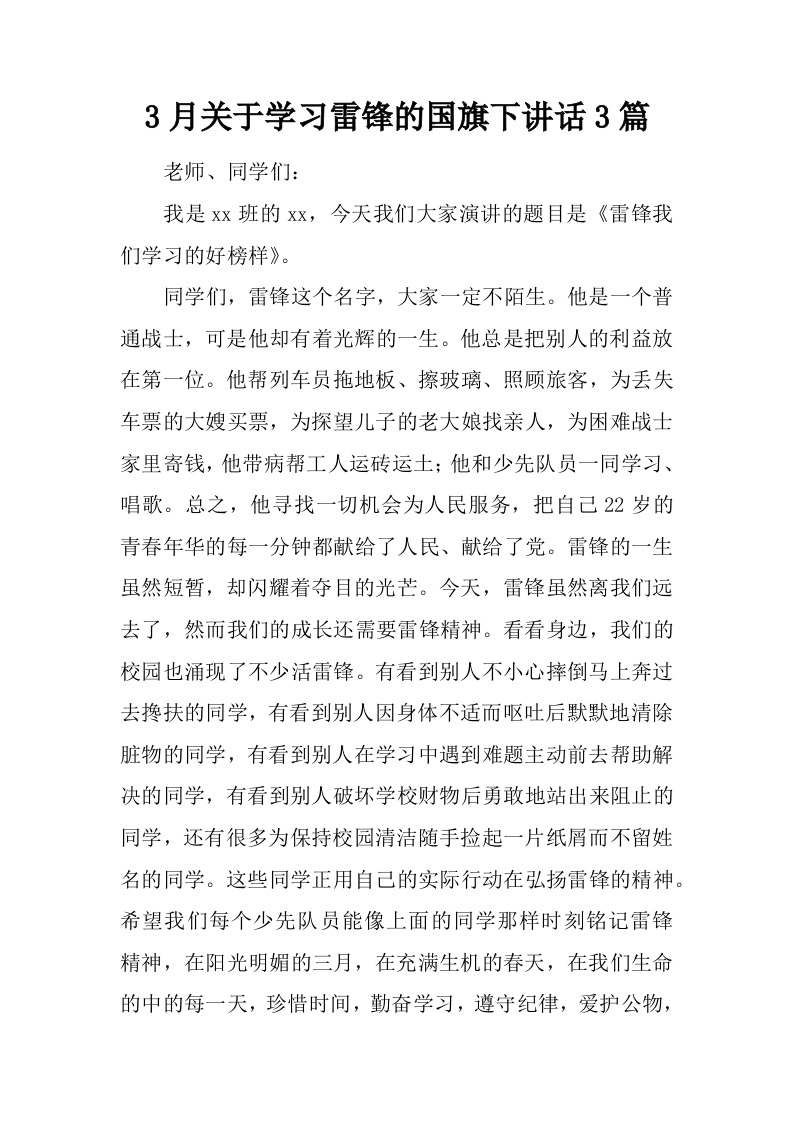3月关于学习雷锋的国旗下讲话3篇[推荐]